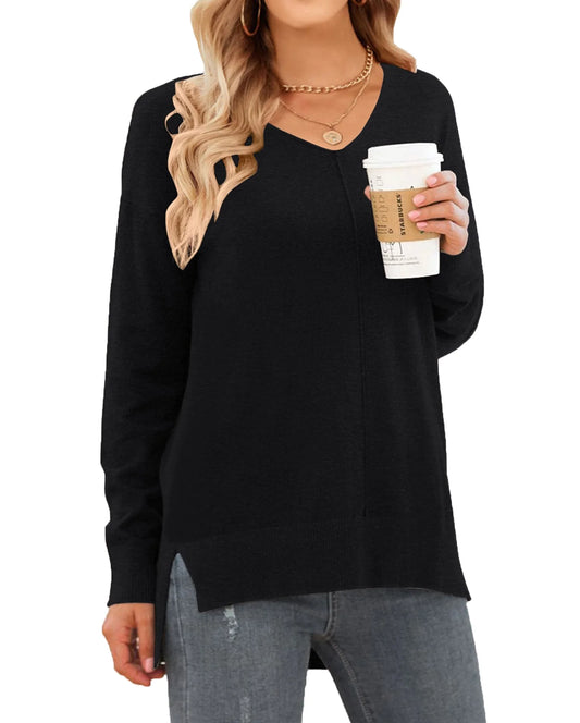 V Neck Sweaters for Women Fall Lightweight Knit Pullover Sweater Side Slits Tops